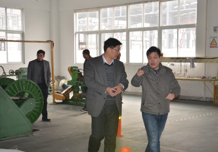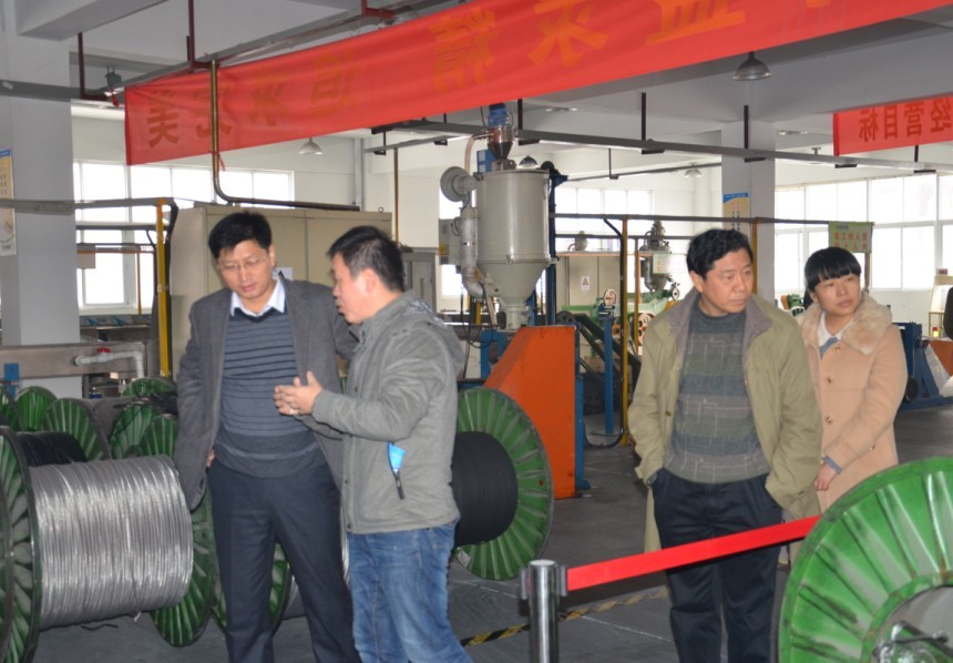 縣委孫書記、開發(fā)區(qū)領導仔細聆聽計總介紹關于我司自限溫電熱帶,恒功率電伴熱帶生產(chǎn)工藝流程